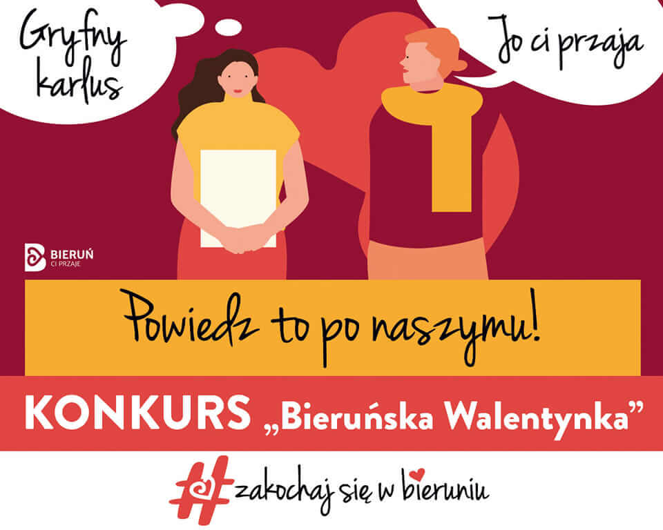 Ogłaszamy konkurs na najpiękniejsze, najbardziej dowcipne i pomysłowe życzenia walentynkowe po śląsku. Najciekawsze życzenia zostaną wykorzystane w wydanej przez miasto unikalnej kartce walentynkowej! Oprócz nagrody głównej, przyznana zostanie też nagroda publiczności! Zwycięzcy otrzymają upominki z logo „Bieruń Ci przaje”.