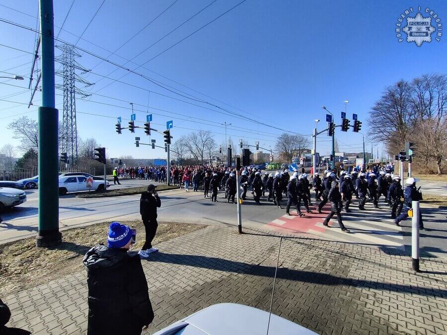W trakcie trwania meczu nieznani sprawcy rozłożyli flagę wielkoformatową oraz odpalili race. Z tego powodu doszło do przerwania widowiska. Teraz kryminalni ustalają tożsamość osób, które dopuściły się tzw. przestępstw stadionowych.