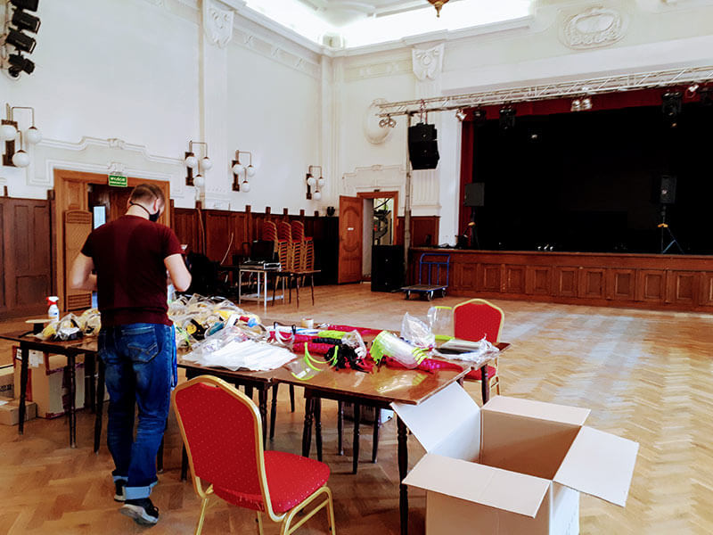 Wolontariusze przywożą w to miejsce materiały wydrukowane przez drukarzy z całego Śląska. W największej, zabytkowej sali domu kultury, w której na co dzień odbywają się spotkania, bale i widowiska, trwa montaż i pakowanie masek, które potem trafiają do szpitali i innych potrzebujących osób.