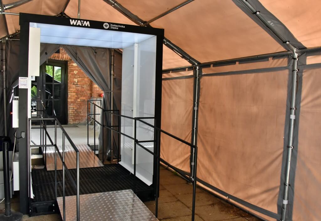 Brama, która stanęła w Muzeum, to zmodyfikowana wersja urządzenia opracowanego pierwotnie na Politechnice Śląskiej i startupu technologicznego WAAM na potrzeby szpitali walczących z COVID-19. Model, który powstał specjalnie na potrzeby muzeów, został opracowany we współpracy z Muzeum Auschwitz.